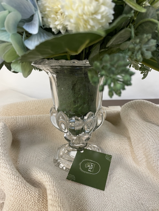 A Ânfora Hortênsia é uma peça exclusiva, feita à mão em nosso ateliê, que une delicadeza e sofisticação. Com suas hortênsias cuidadosamente dispostas em vidro transparente, ela é perfeita para decorar mesas laterais, de centro, aparadores ou prateleiras, elevando a elegância de qualquer ambiente. Um toque sutil e refinado para sua decoração.