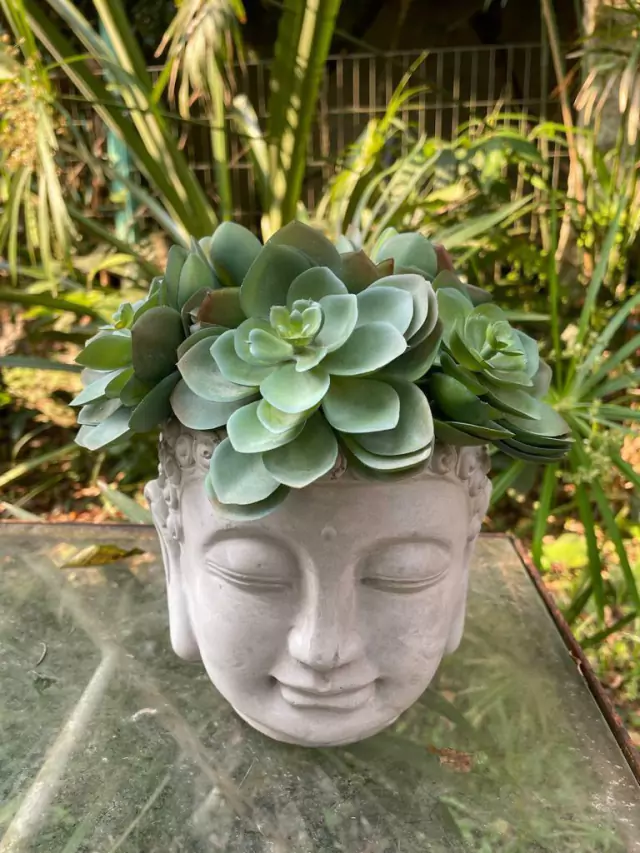 Cachepot Cabeça de Buda decorado com suculentas permanentes, prontinho para levar aconchego e leveza para sua casa! :)