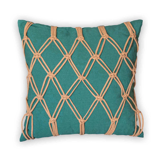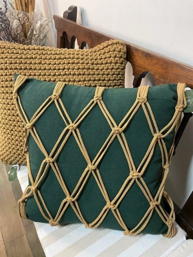 Almofadas com cor e textura para o seu ambiente! A Capa de almofada Trancelim Macramê tem tecido plano reciclado na cor verde escuro com acabamento na tipologia artesanal macramê feito com trancelim caramelo.