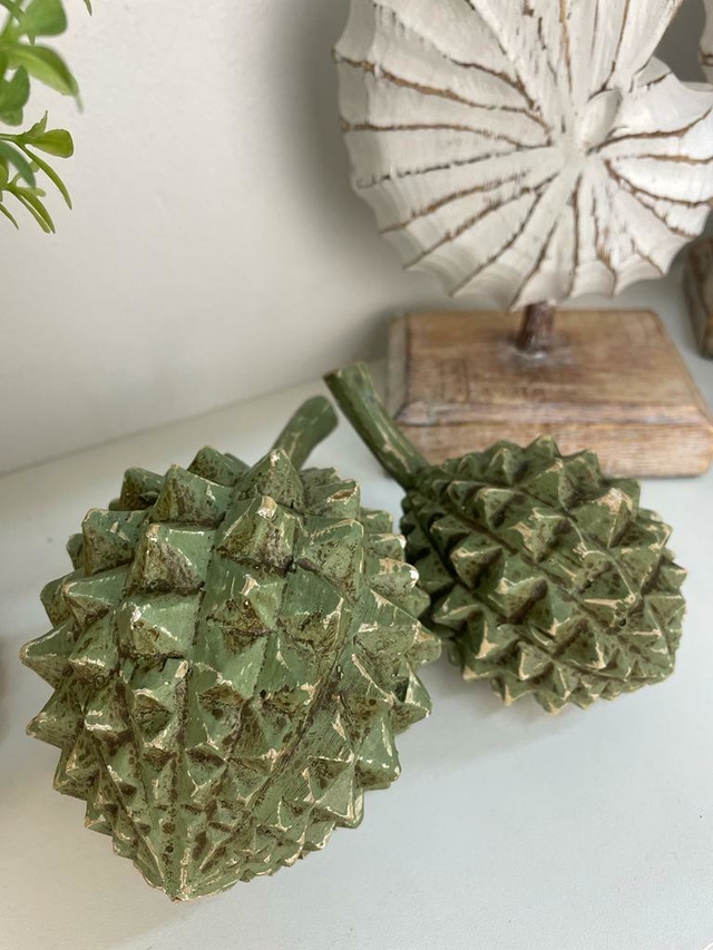 Nosso Durian decorativo, frutinha exótica da Indonésia, veio direto de Bali pra você! Uma peça especial, toda trabalhada na madeira e em um tom de verde que é fácil de compor com outros objetos decorativos, principalmente os que trazem algum elemento da natureza. Lindo e super diferente!