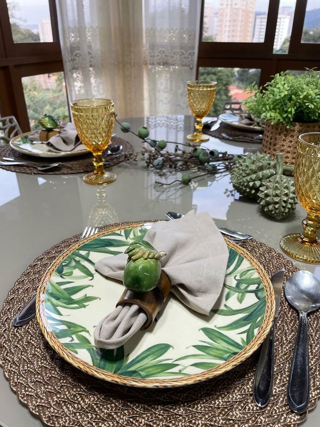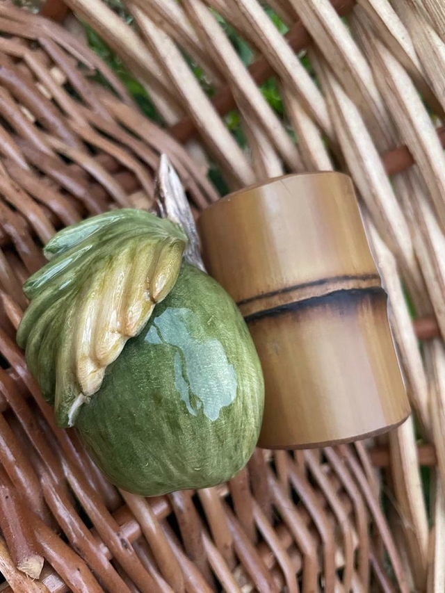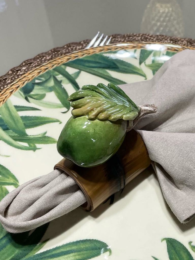 Esse porta guardanapo é muito especial! Com estrutura de bambu e coco verde em cerâmica, pintado à mão, cada peça é única! Super delicado, completa com cor, muita vida e beleza a sua mesa! :)