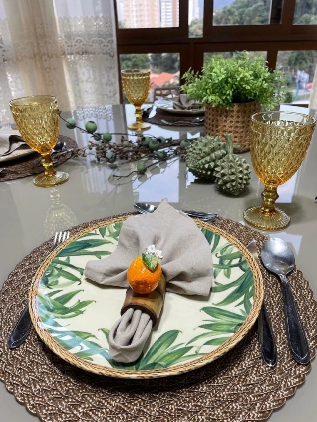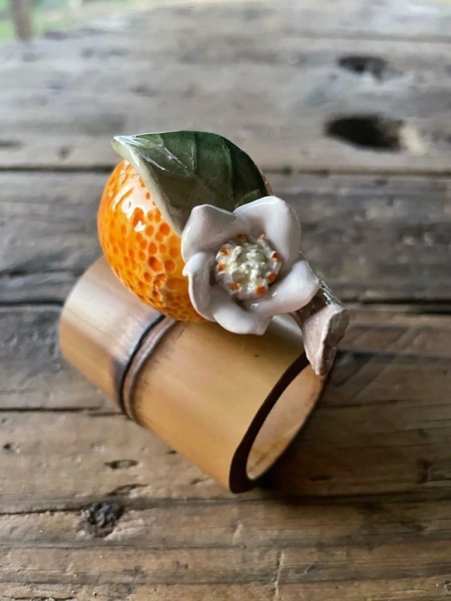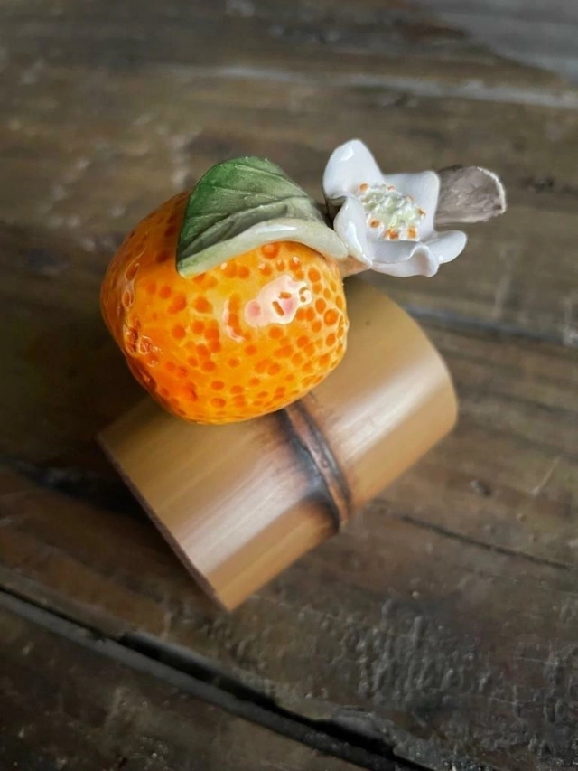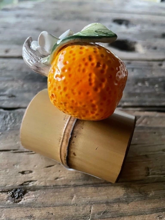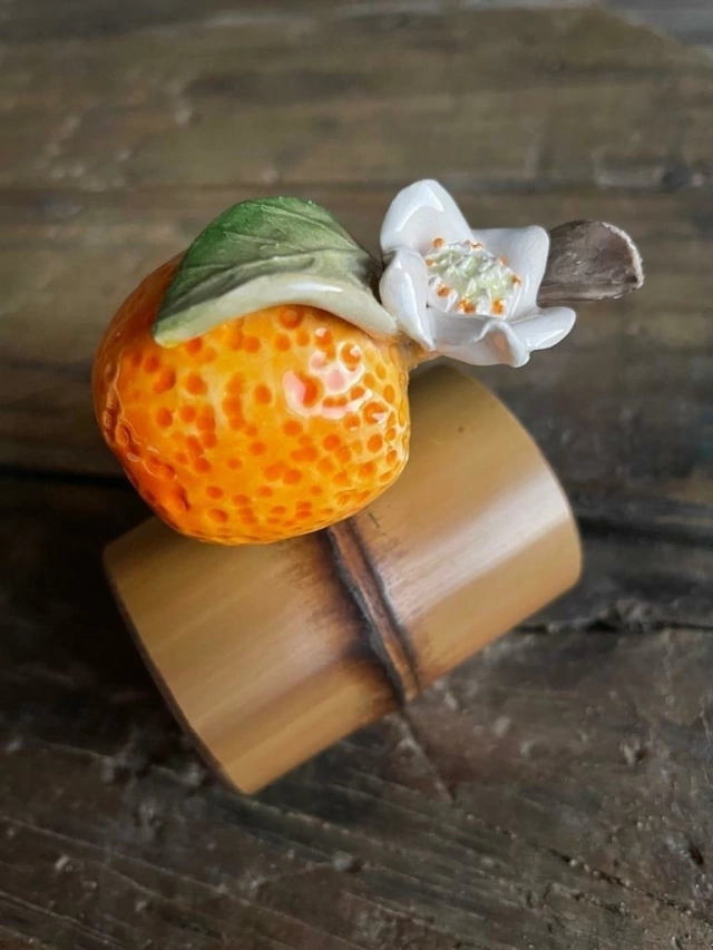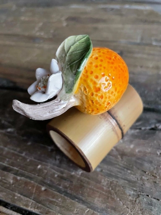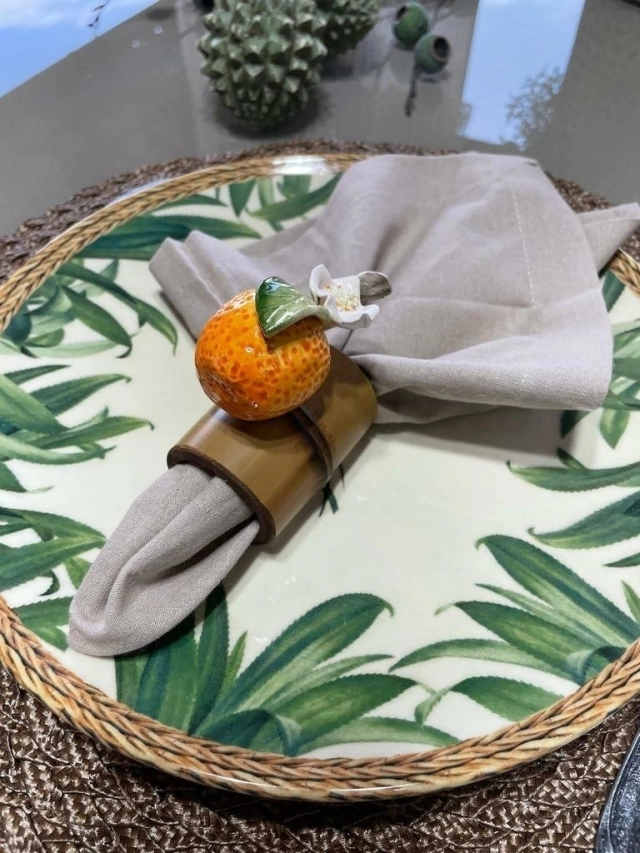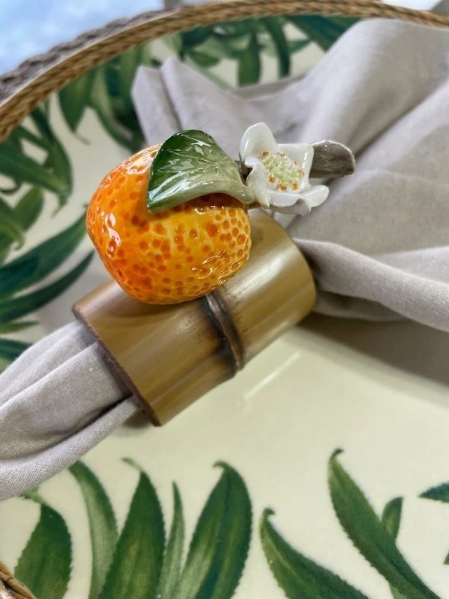 Esse porta guardanapo é muito especial! Com estrutura de bambu e laranjinha em cerâmica, pintado à mão, cada peça é única! Super delicado, completa com cor, muita vida e beleza a sua mesa! :)