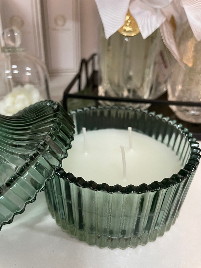 Vela com uma linda embalagem em vidro verde com tampa, perfeito para decorar uma bandeja, a mesa lateral, de centro ou o lavabo.